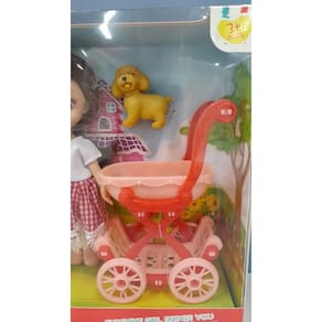 1 boneca, 1 carrinho de passeio, 1 cachorro, 1 casinha de cachorro, 4 lanches..