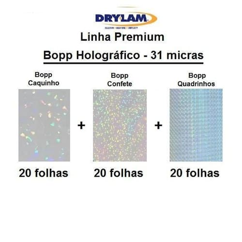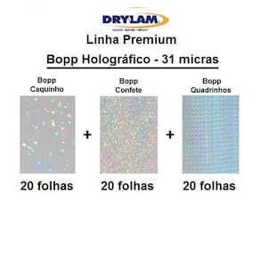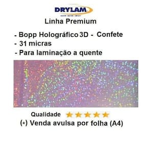 - marca drylam u. S. A. - linha premium - qualidade sem igual. - o melhor holográfico do mundo. - não tem emendas - não perde os holograma após a aplicação - bopp holográfico - espessura: 31 micras - temperatura de aplicação de até 110 graus