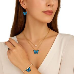 Kit Bijuteria Borboleta Azul Colar Brinco Pulseira Festa é a escolha ideal para quem busca um toque delicado e elegante no visual. O conjunto conta com colar de corrente dourada dupla com pingente de borboleta azul vibrante e pérola central, brincos pendentes com o mesmo design encantador e pulseira ajustável com aplicação idêntica. Perfeito para ocasiões especiais como festas, casamentos e jantares, esse kit valoriza produções românticas e femininas. Também é uma excelente opção de presente criativo para quem ama acessórios com personalidade e charme.