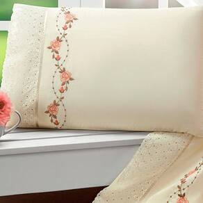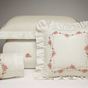 Porta-travesseiros e Almofada: Tecido 80% Algodão / 20% Poliéster; Bordado delicado Floral e detalhe em Lase.