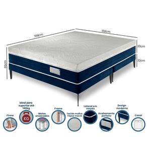 Colchão possui tampo em malha 100% Poliéster Gramatura 440g/m , 7 cm espuma convencional densidade 33kg/m , certificada, fabricação própria, camada isolante (feltro) colado sobre molas ensacadas individualmente de 15cm, poliestireno Expandido de 8cm, Espuma convencional Densidade 20kg/m de 2cm ao fundo tecido plano 100% Poliéster Gramatura 97g/m, e na sua lateral com tecido Veludo Azul 100% Poliéster com toque macio dando mais conforto. Sua Base luxuosa produzidas por madeira reflorestáveis de eucalipto, com pés de metal de 18cm, revestido em veludo Azul 100% Poliéster com toque macio.