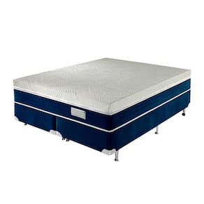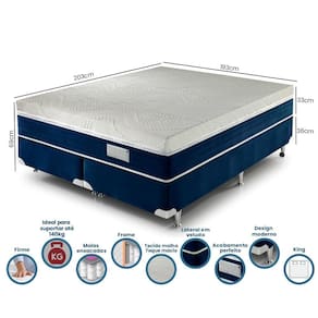 Colchão possui tampo em malha 100% Poliéster Gramatura 440g/m , 7 cm espuma convencional densidade 33kg/m , certificada, fabricação própria, camada isolante (feltro) colado sobre molas ensacadas individualmente de 15cm, poliestireno Expandido de 8cm, Espuma convencional Densidade 20kg/m de 2cm ao fundo tecido plano 100% Poliéster Gramatura 97g/m, e na sua lateral com tecido Veludo Azul 100% Poliéster com toque macio dando mais conforto. Sua Base produzidas por madeira reflorestáveis de eucalipto, com pés de metal de 12cm, revestido em veludo Azul 100% Poliéster com toque macio.
