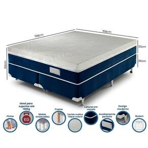 Colchão possui tampo em malha 100% Poliéster Gramatura 440g/m , 7 cm espuma convencional densidade 33kg/m , certificada, fabricação própria, camada isolante (feltro) colado sobre molas ensacadas individualmente de 15cm, poliestireno Expandido de 8cm, Espuma convencional Densidade 20kg/m de 2cm ao fundo tecido plano 100% Poliéster Gramatura 97g/m, e na sua lateral com tecido Veludo Azul 100% Poliéster com toque macio dando mais conforto. Sua Base produzidas por madeira reflorestáveis de eucalipto, com pés de metal de 12cm, revestido em veludo Azul 100% Poliéster com toque macio.