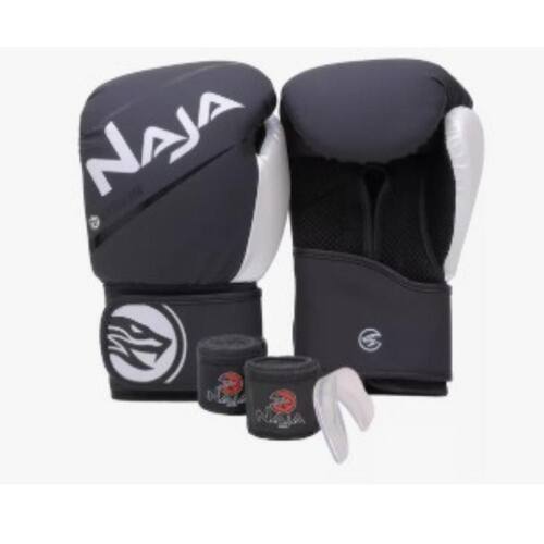 Kit Boxe Muay Thai Naja Black Line + Luva + Bandagem + Bucal COR: Prata Tamanho: 12oz Genero: unissex