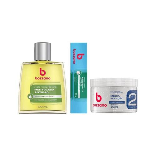 Esse kit contém: 1 Creme Barbear Bozzano 65g Mentolado, 1 Loçao Pos Barba Bozzano Mentolada 100ml e 1 Gel Fixador Bozzano Incolor 300g. Descrição O Creme de Barbear Bozzano 65g Mentolado é ideal para proporcionar um barbear confortável e eficaz. Enriquecido com mentol, este creme cria uma espuma densa e cremosa que facilita o deslizar da lâmina, ajudando a prevenir irritações e cortes. Sua fórmula refrescante acalma a pele durante o barbear, deixando-a macia e suave. Perfeito para todos os tipos de pele, o creme oferece uma sensação de frescor e bem-estar após cada uso. A Loção Pós-Barba Bozzano Mentolada 100ml oferece uma sensação refrescante e após o barbear. Com uma fórmula enriquecida com mentol, esta loção ajuda a acalmar a pele irritada, proporcionando alívio imediato e uma sensação de frescor duradouro. Além de hidratar e suavizar a pele, ela também auxilia na cicatrização de pequenas irritações causadas pela lâmina, deixando a pele macia e revitalizada. O Gel Fixador Bozzano Incolor 300g proporciona uma fixação forte e duradoura, mantendo os penteados no lugar durante todo o dia sem deixar resíduos visíveis. Sua fórmula é ideal para quem busca um acabamento natural, sem comprometer o brilho ou a textura dos fios. Adequado para todos os tipos de cabelo, esse gel fixador permite criar diversos estilos com praticidade, sem deixar o cabelo rígido ou pegajoso. Marca: Não Informado