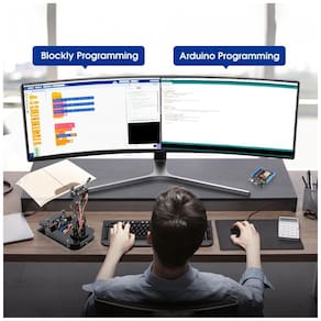 Conteúdo da embalagem: Estruturas e suportes do braço robótico, placa ESP32, servomotores, joystick, shield/placa de expansão, cabos, parafusos e acesso a manuais e códigos de exemplo on-line