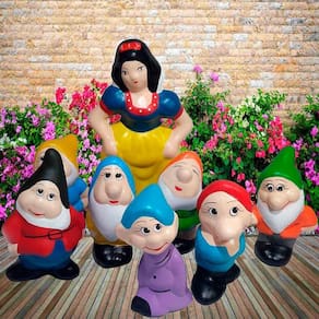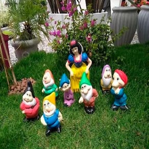 Branca de neve, a bela princesa de nobre coração, é adorada por todas as criaturas do reino, menos uma: a rainha, sua invejosa madrasta. Quando o espelho mágico declara branca de neve como sendo a mais bela de todas, ela foge para a floresta, onde conhece sete adoráveis anões: dunga, mestre, feliz, dengoso, soneca, zangado e atchim. Mas quando a rainha engana branca de neve e a faz morder uma maçã envenenada, somente a magia de um beijo do verdadeiro amor poderá salvá-la. Feito em cerâmica da melhor qualidade, são pintados artesanalmente com pintura reforçada para suportar sol e chuva com durabilidade. Deixe sua casa e jardim com um clima agradável, alegre e descontraído, sendo também uma ótima opção de presente. Dimensões: - branca de neve grande : altura: 23 cm x largura: 19 cm. - anões: altura: 17 cm x largura: 10 cm Características do produto: - cerâmica ecológica de alta qualidade com pintura artesanal que suporta sol/chuva em áreas internas e externas. - produzido por artesões profissionais seguindo um padrão de qualidade que atenda o gosto dos nossos clientes Cuidados: - recomendamos o uso de pano levemente umedecido para sua limpeza. Garantia do produto: - o produto é muito bem acomodado dentro da caixa, e super embalado para evitar quebras, ainda assim possuímos um sistema de garantia e troca. Imagens meramente ilustrativas - produto artesanal, podendo variar de cor e/ou tonalidade