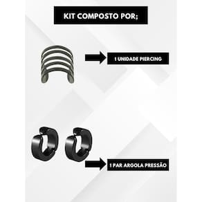 Kit brinco argola pressão pretp cartilagem encaixe falso aço inox antialérgico - 3 peças Kit brinco argola pressão pretp cartilagem encaixe falso aço inox antialérgico - 3 peças Kit brinco na cor aço inox preto é uma ótima opção para presentear um amigo ou namorado. Esse kit é bem completo, pois contém 1 peça do brinco de cartilagem e 2 peças 1 par do brinco pressão argola. Não precisa ter furo para usar - preço do kit com 3 peças - excelente qualidade ============================================== Fotos reais do produto na galeria Detalhes técnicos: Marca: visujóias Modelo: brinco pressão kit Diâmetro: 8mm Espessura do brinco: 4mm Incluso: 3 peças 2 peças 1 par de argola pressão e 3 peças brinco cartilagem . Material: aço inoxidável. Código do produto sku : 3093-1-3332-1-preto : a tem prazo de 6 meses. Todas as peças possuem tratamento antialérgico. ============================================== P:minha compra é segura R:toda compra que é feita aqui está em ambiente seguro, isso significa que se caso ocorra algum imprevisto faremos o estorno de seu pagamento. R: sim. P: precisa de furo para usar O brinco fica caindo R: não não precisa de furo para usar. Colocando o brinco da maneira correta, não fica caindo, pelo contrario, fica bem fixo. Temos um vídeo na galeria explicando como usar. P: produto é a prova d'água R: sim, pode usar em piscinas e praias que não escurece. P: tem R: sim, todos os nossos produtos tem de 6 meses, contra defeitos de fabricação. Todas as informações de cuidados são enviados junto com o produto. P: posta em quanto tempo P: posso trocar se não servir R: sim, enviamos nosso contato junto com o produto para orientação sobre troca. P: posso devolver se não gostar R: sim, caso não goste do produto é só entrar em contato conosco que iremos orientá-lo como efetuar a devolução. Dúvidas Pergunte à vontade, estamos aqui. Ficaremos felizes em responder rapidamente. Aguardamos sua compra e estamos ao seu dispor : Marca: Visujoias