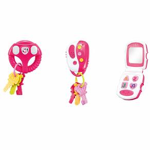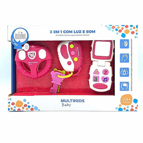 KIT BRINQUEDOS ELETRÔNICOS - 3 EM 1 COM LUZ E SOM - ROSA - MULTIKIDS BABY: os pequenos vão se divertir muito com um kit com 3 brinquedos eletrônicos em uma única embalagem. O Baby 3 em 1 com luz e som da Multikids Baby apresenta um volante eletrônico, conjunto de chaves com alarme e um celular! INFORMAÇÕES: - Produto: Volante, Chave e Celular Rosa - Marca: Multikids Baby - Tipo: Brinquedos eletrônicos - Linha: Primeira Infância - Conteúdo: 1 Volante, 1 Celular e 1 Conjunto de chaves com alarme de carro - Recomendação: para crianças a partir de 24 meses de idade ESPECIFICAÇÕES: - Referência: BR1245 - Embalagem (C x A x L): 34.5 x 23 x 6.5 cm - Embalagem (Peso): 0.425 kg - Material / Composição: plástico - Alimentação: Cada brinquedo utiliza 2 pilhas AA 1.5v - Registro: CE-BRI/BRICS 00706-18 - Certificado: Órgãos Autorizados - OCP´S (Organismos de Certificação de Produtos) BENEFÍCIOS DE BRINCAR: - Eleva a autoestima - Exercita a memória - Estimula o raciocínio - Exercita o imaginário - Desenvolve a criatividade - Desenvolve percepção visual - Desperta a atenção e curiosidade - Desenvolvimento neuropsicológico - Estimula habilidades motoras básicas - Incentiva a comunicação e linguagem - Desenvolve aspectos emocionais e afetivo - Estimula o reconhecimento de formas e cores AVISO: - As imagens são meramente ilustrativas - Os tamanhos e medidas são aproximados - As cores e estampas dos produtos podem ter variações - As informações são de responsabilidade do fabricante ou fornecedor