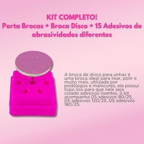 A broca de disco para unhas é uma broca ideal para lixar, polir e muito mais, utilizada por podólogos e manicures, ela possui topo liso para que nele seja colado adesivos lixantes, o kit acompanha 05 adesivos 80/25, 05 adesivos 120/25, 05 adesivos 180/25.
