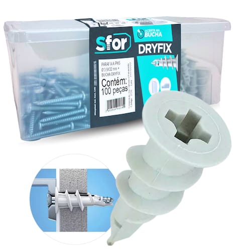 Conteúdo: 100 Buchas Dryfix SFOR 100 Parafusos 01 Caixinha Organizadora para Armazenamento Marca: Não Informado