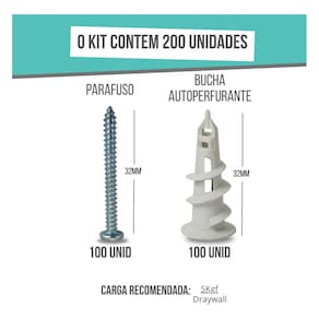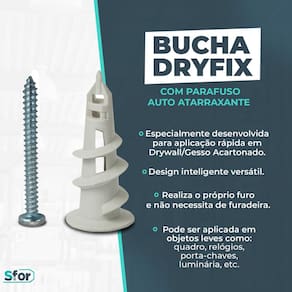 Este kit é a solução definitiva e prática para quem precisa fixar objetos leves e médios em paredes de Drywall (gesso acartonado). A Bucha Dryfix é auto-perfurante, o que significa que ela própria faz o furo, eliminando a necessidade de usar uma furadeira ou ferramentas pesadas para a instalação. O sistema caracol garante uma alta resistência ao arrancamento, proporcionando uma fixação segura e rápida, ideal para suportes de quadros, prateleiras leves, luminárias e caixas de luz, tornando seus projetos de instalação muito mais ágeis e limpos. Todo o material é entregue em uma caixinha organizadora reutilizável, perfeita para manter as peças guardadas e facilitar o transporte.