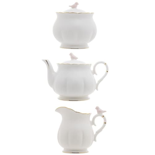 Kit Bule + Açucareiro + Leiteira Birds de Porcelana Branco, Dourado e Rosa Wolff