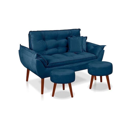 Kit C/ 01 Namoradeira Opala + 02 Puffs Redondo Danny + 02 Almofadas Suede Azul Marinho