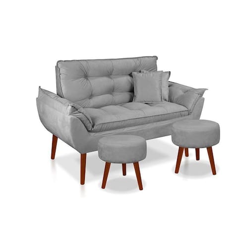 Kit C/ 01 Namoradeira Opala + 02 Puffs Redondo Danny + 02 Almofadas Suede Cinza Claro