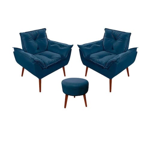 Kit C/02 Poltronas Opala + 01 Puff Redondo Danny Suede Azul Marinho