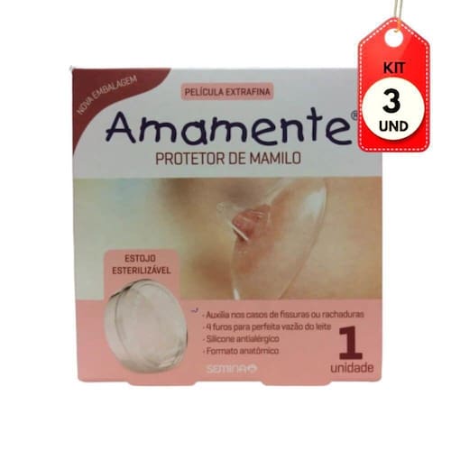 Kit C/03 Amamente Protetor De Mamilo Intermediário DESCRIÇÃO: Protetor de Mamilo Amamente é indicado em casos de dores causadas por fissuras e rachaduras.AÇÃO/ATIVOS: Feito de silicone antialérgico, é inodoro e sua película extra fina e macia se adapta com facilidade à mama. Permite a troca de calor entre a mãe e o bebê. Possui 4 furos para perfeita vazão do leite. Imagem meramente ilustrativa. O produto pode ter variação de cor ou desenho, porém as características gerais são as mesmas especificadas na descrição do produto.MODO DE USAR: Mergulhe o protetor de mamilo em água morna por alguns minutos para deixá-lo mais flexível. Esfregue um pouco de leite materno na parte interna da base do protetor para ajudar na vedação e minimizar o atrito. Aplique um pouco de leite materno na ponta do protetor para desencadear o reflexo de ejeção.ESTE KIT CONTÉM: 03 UNIDADES DE AMAMENTE PROTETOR DE MAMILO INTERMEDIÁRIOKit C/03 Amamente Protetor de Mamilo IntermediÃrio
