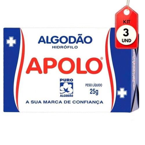 Kit C/03 Apolo Algodão Caixinha 25g DESCRIÇÃO: Produzido a partir de rigorosa seleção de fibras naturais, 100% hidrofilizado, que asseguram qualidade, higiene, maciez e alto poder de absorção de líquidos aquosos e gordurosos.AÇÃO/ATIVOS: Algodão 100% hidrofilo, macio e extra-absorvente. Use na higienização, na aplicação de cosméticos, remoção de maquiagem e esmalte.MODO DE USAR: Aplicar no algodão o produto a ser utilizado e espalhar sobre a pele.ESTE ANÚNCIO CONTÉM: 03 Apolo Algodão Caixinha 25gKit C/03 Apolo AlgodÃo Caixinha 25g