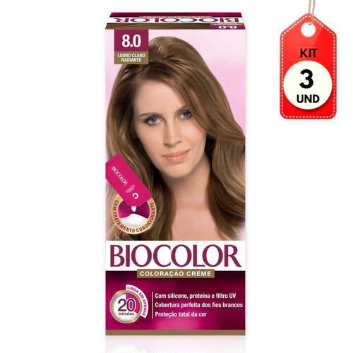 Kit C/03 Biocolor Coloração Mini 8.0 Louro Claro Radiante DESCRIÇÃO: Biocolor proporciona cores vivas, brilhantes e duradouras, garantindo cobertura perfeita da cor desejada, inclusive dos fios brancos, sua fórmula possui filtro solar, que protege a cor dos danos causados do dia a dia, o sachê de tratamento possui fórmula enriquecida com ingredientes condicionantes que conferem maciez aos cabelos.AÇÃO/ATIVOS: Com silicone, proteína e filtro uv, cobertura perfeita dos fios brancos, proteção total da cor.MODO DE USAR: Mais informações no verso da embalagem.ESTE ANÚNCIO CONTÉM: 03 Biocolor Coloração Mini 8.0 Louro Claro RadianteKit C/03 Biocolor ColoraÃÃo Mini 8.0 Louro Claro Radiante