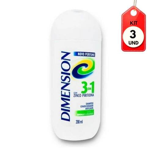 Kit C/03 Dimension Anticaspa 3x1 Shampoo 200ml DESCRIÇÃO:Com o Shampoo Anticaspa 3 em 1 Dimension para Cabelos Oleosos você limpa seus cabelos e os condiciona de forma adequada. Imagem meramente ilustrativa. O produto pode ter variação de cor ou desenho, porém as características gerais são as mesmas especificadas na descrição do produto.AÇÃO/ATIVOS:Ele possui fórmula com sais minerais, ingredientes adstringentes que equilibram a oleosidade do couro cabeludo, evitando que eles voltem a ficar oleosos rapidamente.MODO DE USAR:Dispensa o uso de outros produtos após o shampoo.ESTE KIT CONTÉM: 03 UNIDADES DE DIMENSION ANTICASPA 3X1 SHAMPOO 200MLKit C/03 Dimension Anticaspa 3x1 Shampoo 200ml