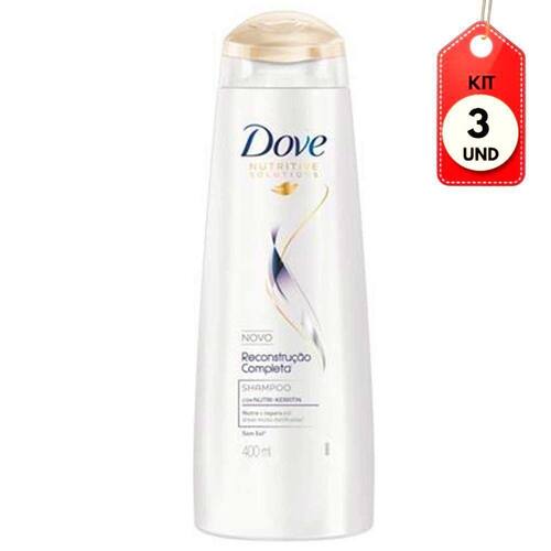 Kit C/03 Dove Reconstrução Completa Shampoo 400ml DESCRIÇÃO: Restaure a força de seus cabelos com um tratamento que progressivamente nutre os cabelos danificados, a linha dove reconstrução completa para cabelos danificados foi feita com ingredientes reparadores de nutri-queratina, restaura danos da superfície enquanto nutre profundamente, trazendo maciez e fortificando seus cabelos desde a primeira lavagem, sinta-se confiante do jeito que você é e faça sucesso por onde passar, tendo você cabelo curto, comprido, com tintura, cacheado, crespo, liso, alisado ou da forma que você escolher. AÇÃO/ATIVOS: A nutri-queratina é um composto que está presente na linha dove reconstrução completa que ajuda a nutrir e hidratar profundamente seus cabelos desde a primeira lavagem, este shampoo de uso diário é o tratamento perfeito para reconstrução dos cabelos danificados por química ou contato com o calor do secador ou da chapinha.MODO DE USAR: O ideal é lavar os cabelos diariamente ou a cada dois dias, na hora de lavar, nada de esfregar as unhas no couro cabeludo, a massagem é fundamental, mas com delicadeza e com as pontas dos dedos, lembre sempre de retirar 100% dos produtos na hora da lavagem para que aparência dos fios não fique prejudicada.ESTE ANÚNCIO CONTÉM: 03 Dove Reconstrução Completa Shampoo 400mlKit C/03 Dove ReconstruÃÃo Completa Shampoo 400ml