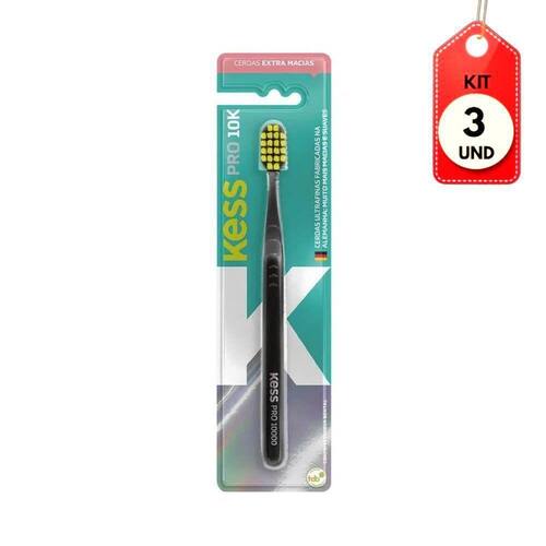 Kit C/03 Kess Escova Dental Pro 10k White Extra Macia DESCRIÇÃO:Escova Dental Pro 10k White Kess possui cerdas extra macias e ultrafinas de material especial que oferecem maior conforto na escovação, são gentis com a gengiva e mantém a limpeza ideal dos dentes. AÇÃO/ATIVOS:Seu formato com cerdas pequenas e arredondadas não permite que as gengivas sejam machucadas. Além de facilitar a eliminação da placa bacteriana entre os dentes e a região da gengiva, evitando o mau hálito, também promove higiene bucal competa e eficiente. Imagem meramente ilustrativa. O produto pode ter variação de cor ou desenho, porém as características gerais são as mesmas especificadas na descrição do produto.MODO DE USAR:Escove os dentes diariamente depois de cada refeição, pelo menos 3 vezes ao dia ou segundo orientação do seu dentista. ESTE KIT CONTÉM: 03 UNIDADES DE KESS ESCOVA DENTAL PRO 10K WHITE EXTRA MACIAKit C/03 Kess Escova Dental Pro 10k White Extra Macia