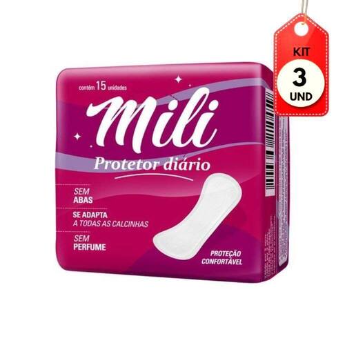 Kit C/03 Mili Protetor Diário Absorvente C/15 DESCRIÇÃO: Práticos e ideais para os pequenos fluxos fora do ciclo menstrual. Mili Protetor Diário é fácil de colocar e fácil de trocar. Para um dia a dia leve e refrescante. AÇÃO/ATIVOS: Formato versátil: se adapta a qualquer calcinha.MODO DE USAR: Retire a fita adesiva central do absorvente. Fixe o absorvente no centro da calcinha, ajustando por baixo da mesma.ESTE ANÚNCIO CONTÉM: 03 Mili Protetor Diário Absorvente C/15Kit C/03 Mili Protetor DiÃrio Absorvente C/15