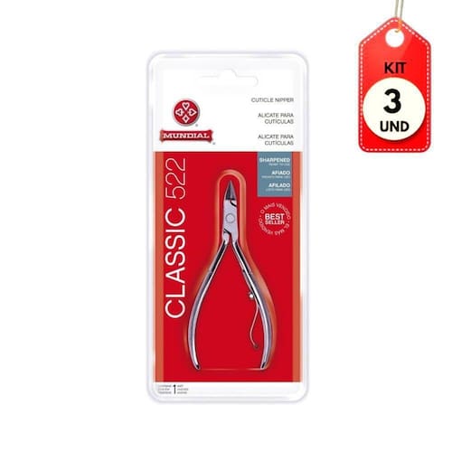 Kit C/03 Mundial 522 Clássico Alicate De Cutícula DESCRIÇÃO: O alicate de cutícula preferido das manicures.AÇÃO/ATIVOS: Lâminas afiadas. Corte preciso e alta durabilidade. Mola resistente com redutor de atrito. Cabo texturizado: não desliza e oferece mais segurança ao manuseio. Aço carbono niquelado. Embalagem: Blister.MODO DE USAR: Umedeça as unhas para facilitar o corte e com o Alicate para unhas Merheje Professional corte-as acompanhando seu formato natural. Sua afiação especial garante um corte rápido e preciso.ESTE ANÚNCIO CONTÉM: 03 Mundial 522 Clássico Alicate De CutículaKit C/03 Mundial 522 ClÃssico Alicate de CutÃcula