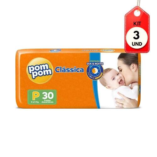 DESCRIÇÃO:Fralda Descartável Clássica Pom Pom conta com canais super absorventes e gel que absorve o líquido duas vezes mais rápido, assim, você terá mais tranquilidade sabrendo que seu bebê está protegido o tempo todo. AÇÃO/ATIVOS:Desenvolvida com exclusiva tecnologia que não deixa a fralda pesar e cair, protege por até 12 horas de absorção, mantendo a pele do bebê sempre sequinha. Além disso, possui barreiras que evitam vazamentos e abas elásticas que proporcionam maior conforto e ajuste a cintura do seu bebê. Imagem meramente ilustrativa. O produto pode ter variação de cor ou desenho, porém as características gerais são as mesmas especificadas na descrição do produto.MODO DE USAR:Coloque a fralda limpa e aberta debaixo do bumbum do bebê, ajustando para ficar centralizada, descole as fitas ajustáveis e fixe-as sobre a parte frontal da falda, ajustando de acordo com o corpinho do bebê. ESTE KIT CONTÉM: 03 UNIDADES DE POM POM CLASSICA FRALDA INFANTIL JUMBO P C/30Kit C/03 Pom Pom ClÃssica Fralda Infantil Jumbo P C/30