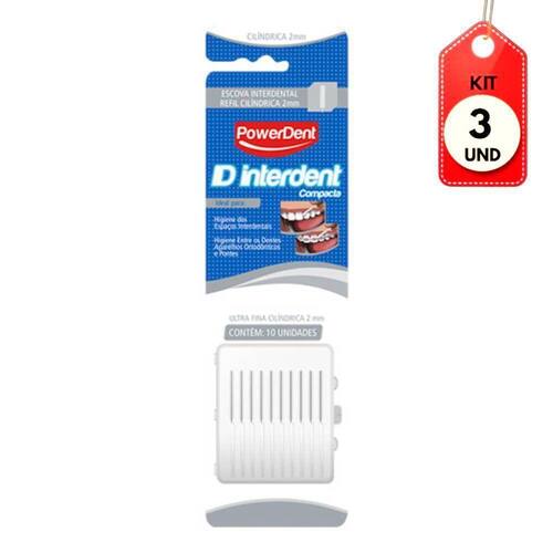 Kit C/03 Powerdent Escova Cilíndrica Ultra Fina 2mm Refil DESCRIÇÃO: Id Interdental Cilíndrico Ultra Fina 2 mm refil.AÇÃO/ATIVOS: Escova Interdental cilíndrico ultra fina que oferece conforto e praticidade na higienização entre os dentes.MODO DE USAR: Localize o espaço entre dois dentes e insira a ponta da escova de forma inclinada em um ângulo de aproximadamente 45 graus em direção à gengiva. Nos dentes superiores, incline a escova para cima e, nos dentes inferiores, incline a escova para baixo. Este acesso deve ser feito delicadamente com uma pressão suave e sem forçar a escova. Dê preferência para os dentes da frente ou anteriores. Deslize a escova perpendicularmente em relação aos dentes em um movimento de fora para dentro da boca. A escova deve deslizar facilmente, sem qualquer pressão. O uso da escova deve ser feito diariamente, mas apenas insira e remova, não há necessidade de repetir o movimento para frente e para trás. Isto poderia machucar a gengiva ocasionando retrações e provocando espaços ou pontos escuros entre os dentes. Quando a escova interdental é inserida pelas primeiras vezes entre os dentes, é possível que a gengiva sangre um pouco e cause algum desconforto doloroso. Isso não é motivo para preocupação, porque não significa que se tenha traumatizado a gengiva, mas sim que existe uma inflamação prévia causada pela placa bacteriana. Só ocorrem sangramentos nas gengivas quando estão inflamadas pela presença da placa bacteriana ou ao se utilizar uma escova com diâmetro inadequado. Ao utilizar a escova interdental corretamente, o sangramento desaparecerá em até dez dias.ESTE ANÚNCIO CONTÉM: 03 Powerdent Escova Cilíndrica Ultra Fina 2mm RefilKit C/03 Powerdent Escova CilÃndrica Ultra Fina 2mm Refil