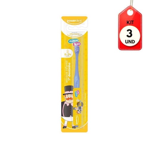 Kit C/03 Powerdent Mundo Bita 1 Dentinho Escova Dental DESCRIÇÃO: A escova dental 1 Dentinho possui cabeça pequena e arredondada, cerdas ultra macias, indicada dos 6 aos 24 anos.AÇÃO/ATIVOS: Desenvolvida para escovação dos primeiros dentinhos do bebê. Possui cabo longo que permite a mamãe executar a escovação com segurança. Suas cerdas são ultra macias perfiladas na altura adequada a delicada arcada do bebê.MODO DE USAR: Escovar os dentes superiores de cima para baixo e os inferiores de baixo para cima, com a escova posicionada num ângulo de 45. Na parte interna dos dentes da frente, a escova deve ficar na vertical. A parte de cima dos molares deve ser escovada em movimento vaivém.ESTE ANÚNCIO CONTÉM: 03 Powerdent Mundo Bita 1 Dentinho Escova DentalKit C/03 Powerdent Mundo Bita 1Â Dentinho Escova Dental