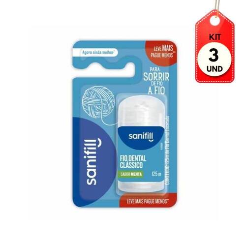 Kit C/03 Sanifill Class Fio Dental 125m DESCRIÇÃO:O Fio Dental Sanifill é resistente ao desfiamento, graças às torções em microfilamentos, e proporciona maior conforto e frescor na limpeza. Imagem meramente ilustrativa. O produto pode ter variação de cor ou desenho, porém as características gerais são as mesmas especificadas na descrição do produto.AÇÃO/ATIVOS:O uso regular do fio dental auxilia na prevenção contra a cárie, problemas na gengiva, mau hálito e no combate à placa bacteriana; sua utilização diária complementa a higiene bucal, pois remove resíduos alimentares entre os dentes, onde as escovas não alcançam.MODO DE USAR:Enrole aproximadamente 40 centímetros do fio ao redor de cada dedo médio, deixando uns dez centímetros entre os dedos. Segurando o fio dental entre o polegar e indicador das duas mãos, deslize-o levemente para cima e para baixo entre os dentes. Passe cuidadosamente o fio ao redor da base de cada dente, ultrapassando a linha de junção do dente com a gengiva. Nunca force o fio contra a gengiva, pois ele pode cortar ou machucar o frágil tecido gengival. Utilize uma parte nova do pedaço de fio dental para cada dente a ser limpo. Para remover o fio, use movimentos de trás para frente, retirando-o do meio dos dentes.ESTE KIT CONTÉM: 03 UNIDADES DE SANIFILL CLASS FIO DENTAL 125MKit C/03 Sanifill Class Fio Dental 125m