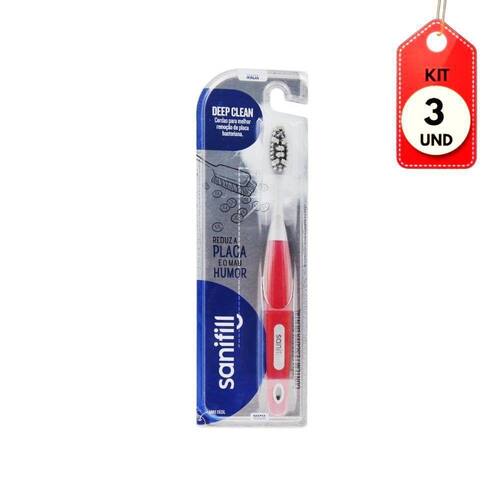 Kit C/03 Sanifill Deep Clean Escova Dental DESCRIÇÃO:Com super tufos de cerdas concentradas e pontas elevadas, promove limpeza profunda e completa. Incluindo áreas de difícil acesso, como dentes posteriores e espaço entre os dentes e a gengiva, para maior remoção da placa bacteriana. Imagem meramente ilustrativa. O produto pode ter variação de cor ou desenho, porém as características gerais são as mesmas especificadas na descrição do produto.AÇÃO/ATIVOS:Limpeza profunda e completa.MODO DE USAR:Escove as superfícies voltadas para a bochecha dos dentes superiores e, depois, dos inferiores. Escove as superfícies internas dos dentes superiores e, depois, dos inferiores. Em seguida, escove as superfícies de mastigação. Para ter hálito puro, escove também a língua, local onde muitas bactérias ficam alojadas.ESTE KIT CONTÉM: 03 UNIDADES DE SANIFILL DEEP CLEAN ESCOVA DENTALKit C/03 Sanifill Deep Clean Escova Dental