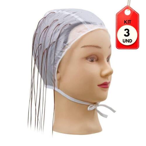 Kit C/03 Santa Clara Touca P/ Mecha C /furo P.v.c. M DESCRIÇÃO:Touca para Mecha Santa Clara é produzida em PVC emborrachado, não possui elasticidade, por isso tem firmeza e se ajusta bem a cabeça. Apresenta alças que podem ser presas na parte frontal, e pode ser reaproveitada. Por se tratar de um PVC emborrachado transparente, ela proporciona facilidade na visualização para quem estiver fazendo o trabalho.AÇÃO/ATIVOS:Com grande quantidade de furos por área e ser confeccionada em PVC transparente, permite que o profissional tenha mais opções na hora de puxar as mechas e mais visibilidade, garantindo um excelente resultado. Molda-se perfeitamente na cabeça, evitando que o produto descolorante extravase para o couro cabeludo. Imagem meramente ilustrativa. O produto pode ter variação de cor ou desenho, porém as características gerais são as mesmas especificadas na descrição do produto.MODO DE USAR:Com o cabelo desembaraçado e penteado para trás, coloque a touca na cabeça e comece a puxar os fios com o auxílio de uma agulha de crochê, puxando as mechas da forma como for melhor e na quantidade que desejar, então aplique o produto de sua preferência para tingir as mechas.ESTE ANÚNCIO CONTÉM: 03 UNIDADES DE SANTA CLARA TOUCA P/ MECHA C /FURO P.V.C. MKit C/03 Santa Clara Touca P/ Mecha C /furo P.V.C. M
