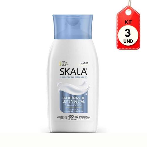 Kit C/03 Skala Proteínas Do Leite Loção Hidratante 400ml DESCRIÇÃO:Creme Hidratante Corporal Proteínas do Leite Skala promove uma hidratação diária de qualidade mantendo a pele protegida e macia, evitando a perda de nutrientes e de sua elasticidade natural.AÇÃO/ATIVOS:Sua nova fórmula é enriquecida com manteiga de Karité, leite de Coco e vitamina E, ativos que hidratam e amaciam a pele, envolvendo seu corpo em um toque de conforto e suavidade, e é extremamente nutritiva. Imagem meramente ilustrativa. O produto pode ter variação de cor ou desenho, porém as características gerais são as mesmas especificadas na descrição do produto.MODO DE USAR:Aplique sobre a pele sempre que sentir necessidade de hidratá-la, massageando suavemente até que seja completamente absorvida.ESTE KIT CONTÉM: 03 UNIDADES DE SKALA PROTEÍNAS DO LEITE LOÇÃO HIDRATANTE 400MLKit C/03 Skala ProteÃnas do Leite LoÃÃo Hidratante 400ml Marca: SKALA COSMÉTICOS