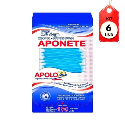 Kit C/06 Apolo Aponete Hastes Flexíveis C/150 DESCRIÇÃO: As hastes flexíveis são produzidas a partir de uma rigorosa seleção de fibras naturais de puro algodão e recebem tratamento especial que as mantém livres de contaminações.AÇÃO/ATIVOS: Permitem uma limpeza segura de regiões delicadas como orelha, nariz, olhos e umbigo.MODO DE USAR: O uso das hastes flexíveis é indicado para a higiene diária das orelhas, além de diversos outros usos, como aplicação de medicamentos e retoque de maquiagem. Cuidado: Não introduza a haste no canal do ouvido externo.ESTE ANÚNCIO CONTÉM: 06 Apolo Aponete Hastes Flexíveis C/150Kit C/06 Apolo Aponete Hastes FlexÃveis C/150