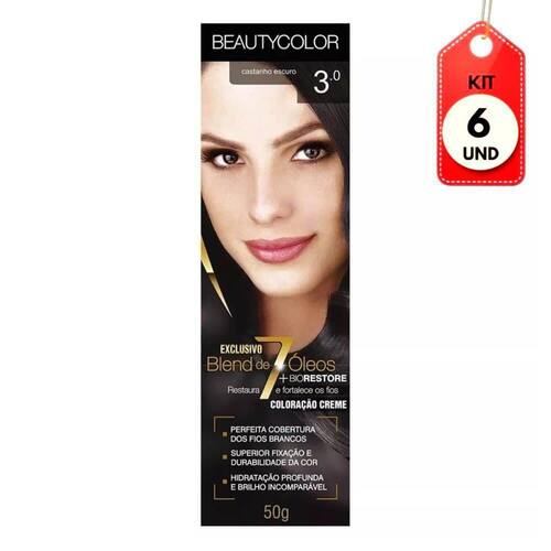 Kit C/06 Beautycolor Tinta Creme 3.0 Castanho Escuro DESCRIÇÃO: A Coloração Creme Permanente Individual 3.0 Castanho escuro Beauty Color restaura e fortalece os fios, promove uma perfeita cobertura dos fios brancos, superior fixação e durabilidade da cor.Uniformiza e intensifica a cor e o brilho quando o cabelo se encontra desbotado e sem brilho, promovendo Hidratação profunda e brilho incomparável. Embalagem Individual para uso cotidianoAÇÃO/ATIVOS: Fórmula enriquecida com Exclusivo Blend de 7 Óleos e BIORESTORE : complexo de aminoácidos essenciais + nutrientes. Garante força, resistência e potencializa a hidratação e brilho dos cabelos garantindo fixação, longa duração da cores e reparação dos fios.MODO DE USAR: Sugestão de Aplicação: 1-Prepare a mistura; 2-Proteja os ombros com uma toalha e a pele com um gel ou creme hidratante; 3-Com a ponta do frasco aplicador, separe pequenas mechas do cabelo e vá aplicando o produto pela raiz, comprimento e pontas; 4-Em seguida, massageie suavemente os cabelos até que o produto esteja distribuído uniformemente; 5-Deixe agir por 20 minutos. Não utilize touca nem prenda o cabelo durante o tempo de ação do produto; 6-Terminando o tempo de ação, enxágue bem até que a água saia limpa. Não é necessária a aplicação de shampoo; 7-Aplique o Creme de Hidratação Profunda Pós Coloração BEAUTYCOLOR, massageie e deixe agir por alguns minutos; 8-Enxágue. Aplique a Gota Intensificadora de Brilho BEAUTYCOLOR, esfregue uma pequena quantidade na palma das mãos e aplique suavemente nos cabelos úmidos ou secos, concentrando o produto nas pontas. Não enxágue.ESTE ANÚNCIO CONTÉM: 06 Beautycolor Tinta Creme 3.0 Castanho EscuroKit C/06 Beautycolor Tinta Creme 3.0 Castanho Escuro