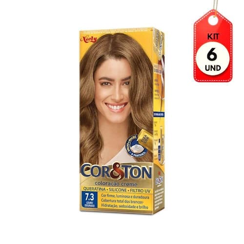 Kit C/06 Cor & Ton Tinta 7.3 Louro Dourado 50g DESCRIÇÃO: É uma coloração permanente com fórmula de altíssima qualidade. Proporciona aos cabelos cores vivas, luminosas e duradouras. Total cobertura dos fios brancos. Hidratação, sedosidade e brilho.AÇÃO/ATIVOS: Com queratina, gérmen de trigo, silicone e filtro UV que garantem cabelos fortes, nutridos e com máxima proteção. Com textura cremosa, facilita a distribuição nos fios, fazendo com que os pigmentos sejam facilmente absorvidos.MODO DE USAR: Utilizar conforme indicado na embalagem.ESTE ANÚNCIO CONTÉM: 06 Cor & Ton Tinta 7.3 Louro Dourado 50gKit C/06 Cor & Ton Tinta 7.3 Louro Dourado 50g