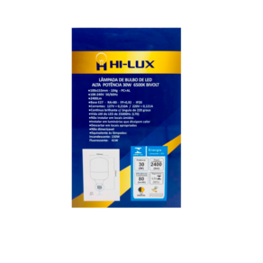 ESPECIFICAÇÕES - Índice de proteção: IP20 - Tensão: Bivolt Automático 100V - 240V - Ângulo de abertura: 220º - IRC**: >80 - Vida útil: 25.000 horas - Potência: 30W - Fluxo luminoso: 2400 lumens - Base: E27 - Temperatura de cor: 6500K (Branca) - Eficiência luminosa: 80lm/W -Dimensão (mm): 100mm x 153mm - Equivalência: Incandescente 150W / Fluorescente 41W