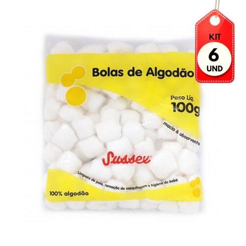 Kit C/06 Sussex Algodão Bolas Branca 100g DESCRIÇÃO: Os Algodões Sussex são indicadas para a limpeza e assepsia da pele, desde as normais até as mais sensíveis como de bebês.AÇÃO/ATIVOS: Composto de fibras 100% algodão, purificadas e alvejadas. Facilita a higienização e assepsia da pele, remoção de maquilagem, esmalte, higiene do bebê, etc.MODO DE USAR: Aplicar no algodão o produto a ser utilizado e espalhar sobre a pele.ESTE ANÚNCIO CONTÉM: 06 Sussex Algodão Bolas Branca 100gKit C/06 Sussex AlgodÃo Bolas Branca 100g