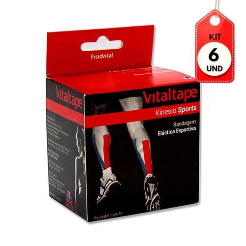 Kit C/06 Vitaltape Bandagem Elástica Kinesio Sports Preta 5cmx5m DESCRIÇÃO:Bandagem Elástica de Kinésio Sports Preta Vitaltape foi desenvolvida para elevar a camada superior da pele, criando um espaço maior entre a pele e os músculos, promovendo assim o fluxo sanguíneo e a drenagem linfática, favorecendo a absorção de substâncias. Sua elasticidade permite que o produto se acomode a qualqur parte do corpo e não restrinja os movimentos. AÇÃO/ATIVOS:Promove suporte dos músculos e articulações. Reduz a fadiga muscular. Estimula a drenagem linfática e o fluxo sanguíneo. Reduz o inchaço e a dor. Dinamização do processo de cura natural. Imagem meramente ilustrativa. O produto pode ter variação de cor ou desenho, porém as características gerais são as mesmas especificadas na descrição do produto.MODO DE USAR:Deve ser aplicada pelo menos 1 hora antes de atividades física ou do banho. Antes da aplicação do produto, limpe a pele com sabonete e água, em seguida seque bem. Alongue o músculo o máximo possível quando estiver aplicando a bandagem. Aplique sem puxar, pois ela já vem estendida em 10%. Dependendo da aplicação, a faixa pode enrugar levemente a pele quando finalizado o processo de colocação. Certifique-se de que a faixa esteja corretamente aplicada. O calor do corpo auxilia na aderência da faixa. Para retirar, basta segurar a pele e puxar delicadamente a faixa no sentido dos pelos.ESTE KIT CONTÉM: 06 UNIDADES DE VITALTAPE BANDAGEM ELÁSTICA KINESIO SPORTS PRETA 5CMX5MKit C/06 Vitaltape Bandagem ElÃstica Kinesio Sports Preta 5cmx5m