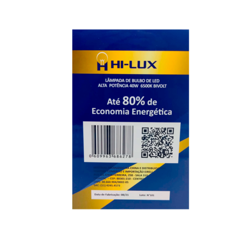ESPECIFICAÇÕES - Índice de proteção: IP20 - Tensão: Bivolt Automático 100V - 240V - Ângulo de abertura: 220º - IRC**: >80 - Vida útil: 25.000 horas - Potência: 40W - Fluxo luminoso: 3200 lumens - Base: E27 - Temperatura de cor: 6500K (Branca) - Eficiência luminosa: 80lm/W -Dimensão (mm): 118mm x 168mm