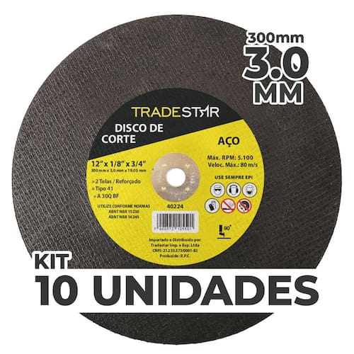 O Disco de Corte Metal 12" (300x3,0 mm) com Furo 19,05 mm é a ferramenta confiável que proporciona cortes rápidos e precisos, garantindo resultados superiores em cada aplicação. Adquira agora e experimente a potência e a precisão que farão a diferença em seus projetos de corte. Disco De Corte Para Aços » Indicado Para Corte De Aços. » 2 Telas/Reforçado. Tamanho: 12" (300 Mm) Espessura: 3,0 MM Furo: 19,05 MM Quantidade por embalagem – 10 unidades