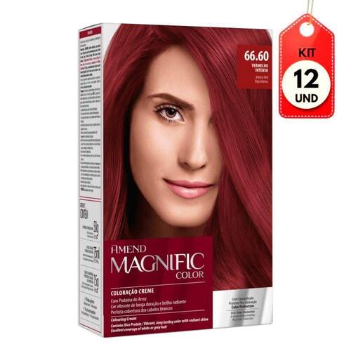 Kit C/12 Amend Magnific Tinta 66.60 Vermelho Intenso DESCRIÇÃO:Tintura Magnific Color Vermelho Intenso 66.60 Amend traz tons vibrantes que promovem cobertura perfeita dos fios brancos. Coloração permanente em creme.AÇÃO/ATIVOS:Sua fórmula é enriquecida com proteína do Arroz que possui efeito restaurador e protetor, ou seja, a cor do seu cabelo é renovada e a estrutura capilar preservada. Garante longa duração, além de proporcionar brilho radiante e maciez enquanto colore os fios. Imagem meramente ilustrativa. O produto pode ter variação de cor ou desenho, porém as características gerais são as mesmas especificadas na descrição do produto.MODO DE USAR:Coloque as luvas. Despeje todo o conteúdo da bisnaga de Coloração Creme dentro do frasco aplicador de Emulsão Reveladora. Feche a tampa do frasco aplicador e agite bem até obter uma emulsão homogênea. Quebre imperativamente a ponta do frasco aplicador imediatamente após ter agitado a mistura, a fim de evitar projeções indesejadas do produto ou estourar o frasco. Aplique a emulsão homogênea nos cabelos, começando pela raiz nos cabelos secos até as pontas. Massageie o cabelo até que a coloração esteja bem distribuída. Deixe agir por cerca de 35 minutos, em seguida enxágue com água em abundância até remover todos os resíduos. Finalize como desejar.ESTE ANÚNCIO CONTÉM: 12 UNIDADES DE AMEND MAGNIFIC 66.60 VERMELHO INTENSOKit C/12 Amend Magnific Tinta 66.60 Vermelho Intenso