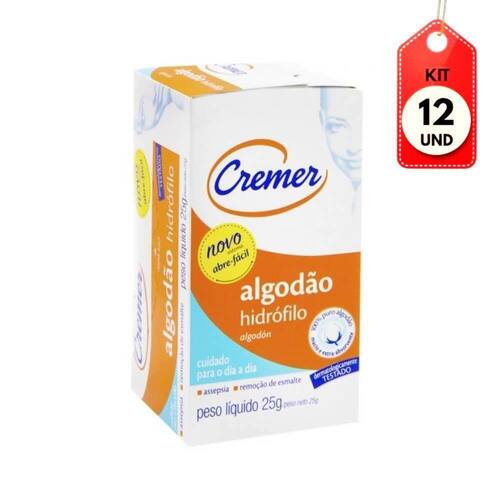 Kit C/12 Cremer Algodão Caixinha 25g DESCRIÇÃO: O algodão Hidrófilo Cremer de caixinha é indicado para uso doméstico na remoção da maquiagem e de esmaltes, higiene do bebê, higienização e assepsia da pele, etc.AÇÃO/ATIVOS: O algodão Hidrófilo Cremer de caixinha é feito com fibras 100% algodão, alvejadas e transformadas em mantas uniformes. São isentos de impurezas e possuem pH neutro.MODO DE USAR: Aplicar no algodão o produto a ser utilizado e espalhar sobre a pele.ESTE ANÚNCIO CONTÉM: 12 Cremer Algodão Caixinha 25gKit C/12 Cremer AlgodÃo Caixinha 25g