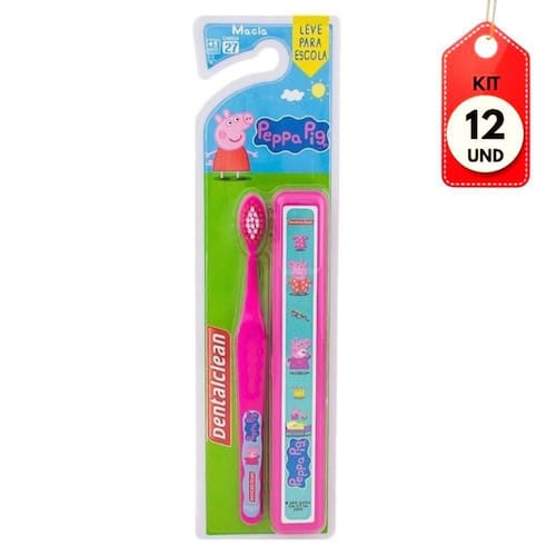 Kit C/12 Dentalclean Peppa Pig Escova Dental C/ Estojo DESCRIÇÃO:Escova Dental Infantil Peppa Pig com Estojo Dental Clean ajuda na hora de cuidar dos dentes das crianças de forma mais divertida. AÇÃO/ATIVOS:Possui ergonomia adequada, cabo emborrachado que proporciona total segurança e praticidade para na hora da escovação. Além disso, acompanha um estojo de material plástico, que protege o produto. Ideal para levar à escola. Imagem meramente ilustrativa. O produto pode ter variação de cor ou desenho, porém as características gerais são as mesmas especificadas na descrição do produto.MODO DE USAR:Encoste as cerdas da escova na região entre a gengiva e os dentes, fazendo movimentos circulares ou verticais, da gengiva para fora, e repetindo o movimento por cerca de 10 vezes, a cada 2 dentes.ESTE ANÚNCIO CONTÉM: 12 UNIDADES DE DENTALCLEAN PEPPA PIG ESCOVA DENTAL C/ ESTOJOKit C/12 Dentalclean Peppa Pig Escova Dental C/ Estojo