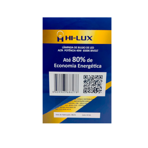 ESPECIFICAÇÕES - Índice de proteção: IP20 - Tensão: Bivolt Automático 100V - 240V - Ângulo de abertura: 220º - IRC**: >80 - Vida útil: 25.000 horas - Potência: 40W - Fluxo luminoso: 3200 lumens - Base: E27 - Temperatura de cor: 6500K (Branca) - Eficiência luminosa: 80lm/W -Dimensão (mm): 118mm x 168mm