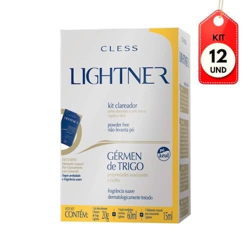 Kit C/12 Lightner Gérmen De Trigo Kit Clareador DESCRIÇÃO: O Kit Clareador Lightner Gérmen de Trigo com propriedades hidratantes e suavizantes foi desenvolvido especialmente para clarear os pelos do corpo deixando sua pele dourada e macia realçando o bronzeado ou simplesmente dando uma aparência delicada à pele.AÇÃO/ATIVOS: Com propriedades suavizantes e fragrância agradável, o kit contém ainda um sache hidratante corporal pós-clareamento enriquecido com óleo essencial de camomila, flavonóides e diversos princípios ativos hidratantes. Toque aveludado e pelos dourados.MODO DE USAR: Misture a loção reveladora junto com o pó descolorante até formar uma mistura homogênea. Aplique com a espátula na área desejada e deixe agir de 10 a 45 minutos de acordo com o grau de clareamento desejado, estrutura, porosidade e cor-base dos pelos. A aplicação deve ser feita nos pelos secos e, após o tempo de ação deve-se retirar totalmente o produto. Não se exponha ao sol durante a aplicação. Ao término enxágue bem e lave normalmente. Em seguida aplique o hidratante corporal pós clareamento. Atenção: não utilize água oxigenada acima de 13 volumes para clareamento dos pelos do corpo.ESTE ANÚNCIO CONTÉM: 12 Lightner Gérmen De Trigo Kit ClareadorKit C/12 Lightner GÃrmen de Trigo Kit Clareador
