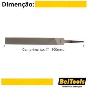 Lima chata bastarda 4" / 100mm - Beltools Possui picado duplo e corte grosso que proporciona maior desbaste. Indicação: Indicada para desbastar metais em superfícies planas. Dureza: 58-62 HRC. Comprimento: 4" - 100mm. Cabo: Não. Perfil: Chata. Tipo de picado: Picado duplo - BASTARDA.