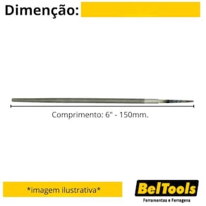 Descrição: Possui picado duplo e corte grosso que proporciona maior desbaste. Indicação: Indicada para desbastar metais com superfícies côncavas, aberturas circulares ou furos. Também conhecida como limatão. Dureza: 58-62 HRC. Comprimento: 6" - 150mm. Cabo: Sem cabo. Perfil: Redonda. Tipo de picado: Picado duplo - BASTARDA